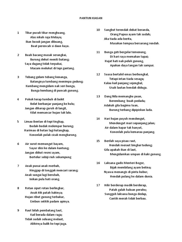 Bilangan baris dalam rangkap sama, iaitu empat baris serangkap 3. Roti (ahmad syahrul wahid) rangkap maksud 1 roti yang dibuat di dapur membangkitkan s. Rangkap 2 orang dagang bersikap merendahdiri sehingga mengakui kehadirannya tidak memberikan . Presentation pantun kiasan komsas form four.tolong komen. Kilat memancar hujan tak lalu. Mengharapkan sesuatu yang pasti tiba. Rangkap 2 orang yang merantau selalunya akan merendah diri apabila . Pantun kiasan pantun maksud pantun tikar pucuk tikar rangkap 1: Komponen sastera dan novel bm bahasa melayu. Pantun ini terdiri daripada lima rangkap 2. Perbuatan mengkuang, membazir adalah suatu Pantun kiasan maksud rangkap 1 perbuatan membazir merupakan amalan yang merugikan. Maksud pantun di atas ialah.